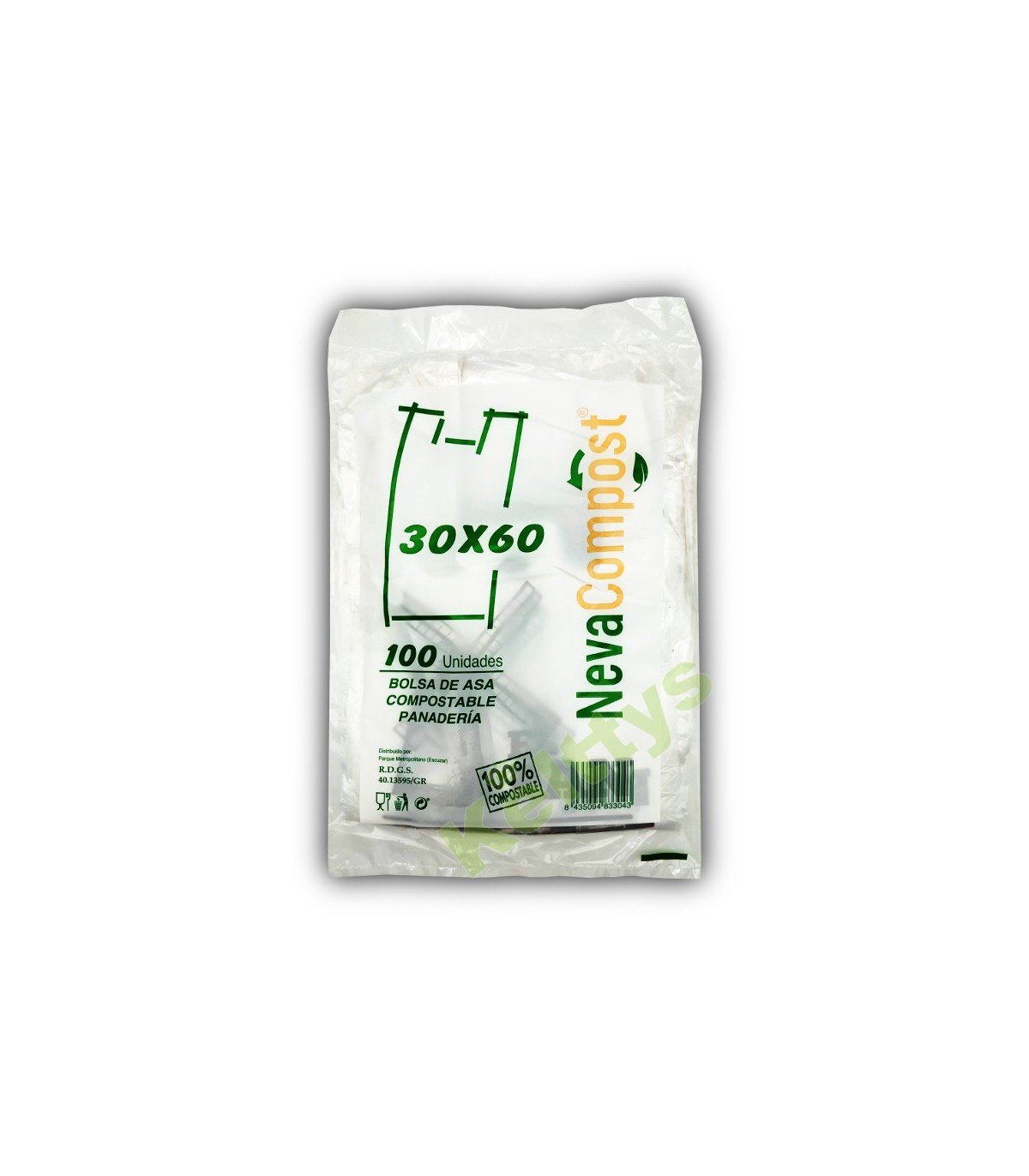 Bolsas de camiseta para panderia fabricadas con materias primas compostables compuestas de polímeros de origen vegetal (maiz, patata y vegetables) y son 100% biodegradables. Los materiales compostables pueden ser transformados en abono. No son un desperdicio sino un recurso perfectamente integrado en el ciclo de la naturaleza. Poseen una medida de 30cm x 60cm y tienen la forma clásica de camiseta. Las bolsas están adornadas con detalles de molinos, trigo y diversos panes, lo que las hacen perfectas para el transporte de pan y bolleria. Las bolsas de asa están diseñadas para comercios, tiendas y panaderias que necesiten suministrar a sus clientes de medios para transportar sus compras de manera sostenible y segura. Además, estas bolsas están exentas de cobro debido a que cumplen con el Art.4.1.a del Real Decreto 293/2018