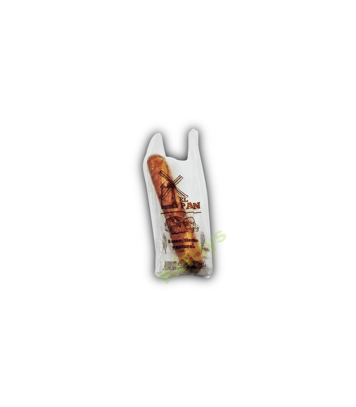 Bolsas de camiseta para panderia fabricadas con materias primas compostables compuestas de polímeros de origen vegetal (maiz, patata y vegetables) y son 100% biodegradables. Poseen una medida de 30cm x 60cm y tienen la forma clásica de camiseta. Las bolsas están adornadas con detalles de molinos, trigo y diversos panes, lo que las hacen perfectas para el transporte de pan y bolleria.