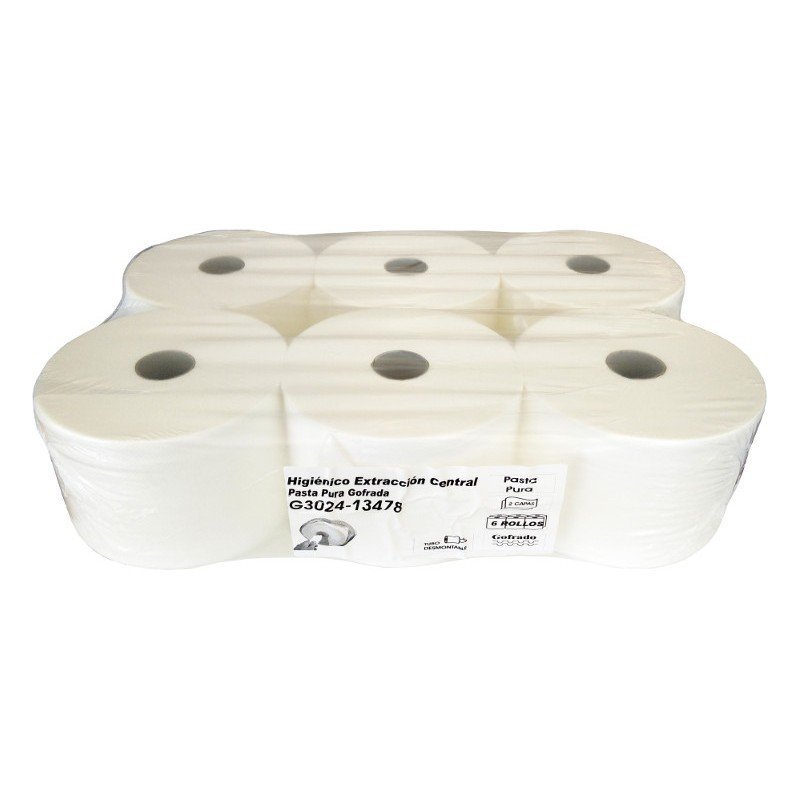 Los rollos de papel higiénico industrial están diseñados para su uso en portarrollos de dispensación central. Estos rollos están pensados para retirar el mandril de cartón, e introducirlos en un portarrollos de papel higiénico de dispensación central. Fabricados con celulosa virgen 100%, cuentan con 2 capas lisas y un precorte que facilita su uso. Cada rollo tiene una longitud aproximada de 158 metros, proporcionando 800 servicios por rollo. El peso de cada rollo es de 720 gramos y su diámetro de 20 cm, con un mandril de 4,5 cm. Se venden en fardos de 6 rollos, con un peso total de 4,32 kilos.